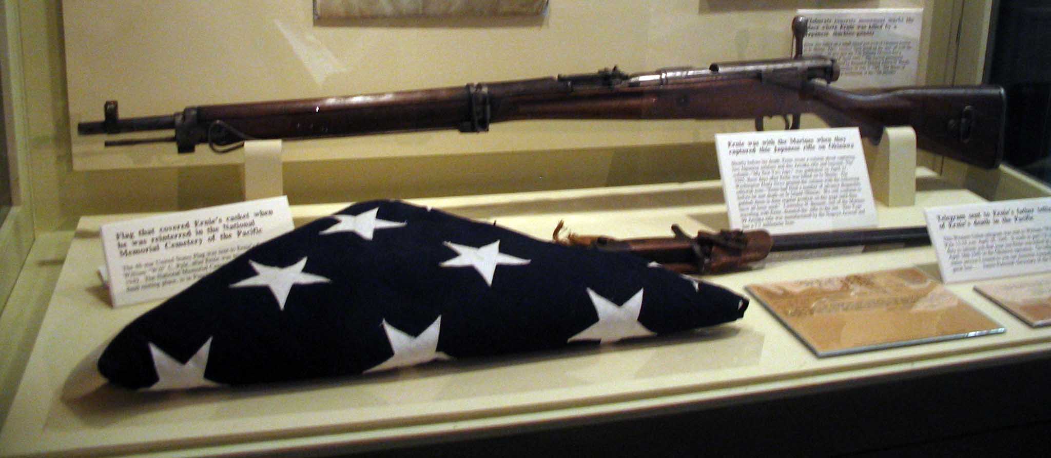 Burial Flag and Captured Rifle This flag was used to cover Ernie’s coffin when he was moved from Ie Shima to the “Punchbowl” cemetery in Hawaii. The rifle belonged to a captured Japanese soldier.